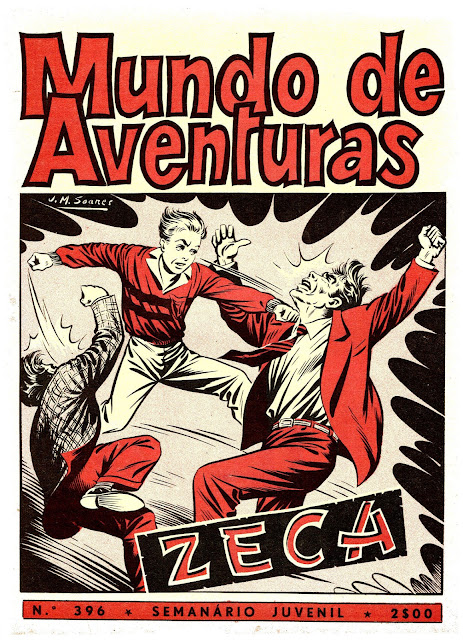 Terminamos uma semana dedicada a José Manuel Soares com uma curtíssima aventura de Zeca que apareceu no Mundo de Aventuras fascículo 437. Ei-lo numa capa elaborada para a aventura anterior pelo seu criador num violento ataque em que faz mesmo lembrar «Cuto».