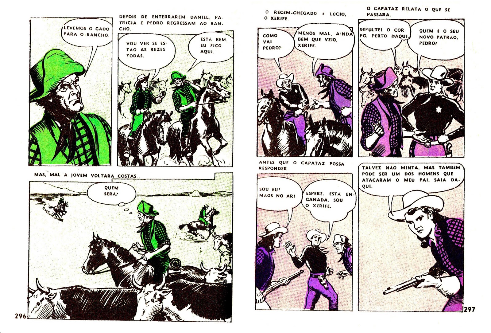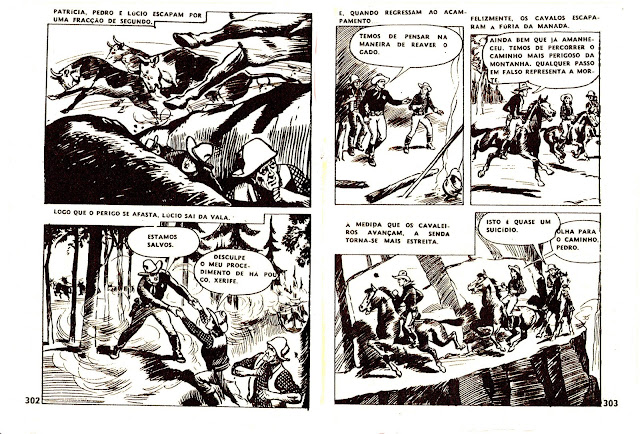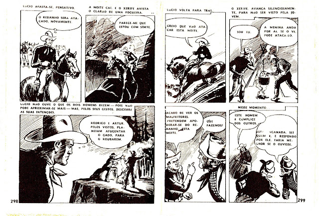 Vejam esta pose do xerife de Alkali pavoneando-se com um «sombrero» em alguma aldeia mexicana. A capa, apesar de excelente, é enganadora: a aventura passa-se mesmo nos USA e versa a descoberta de um conjunto de ladrões de gado.