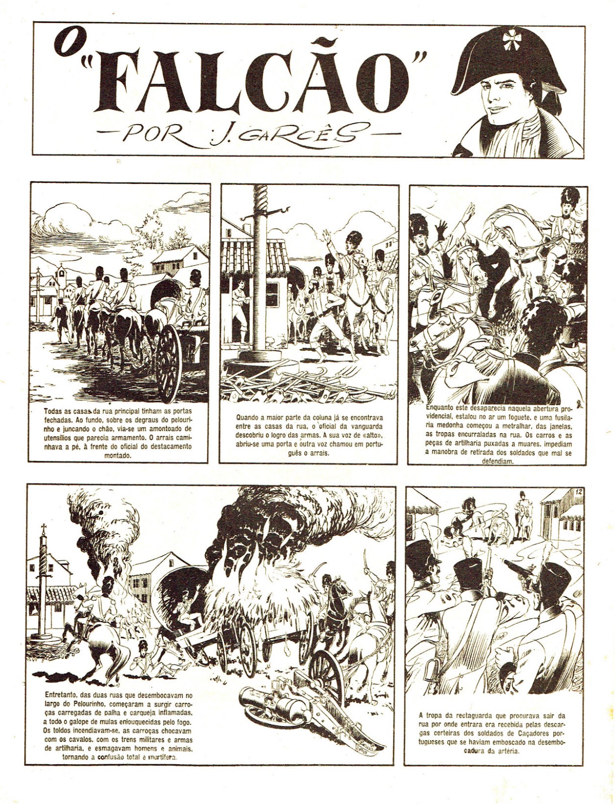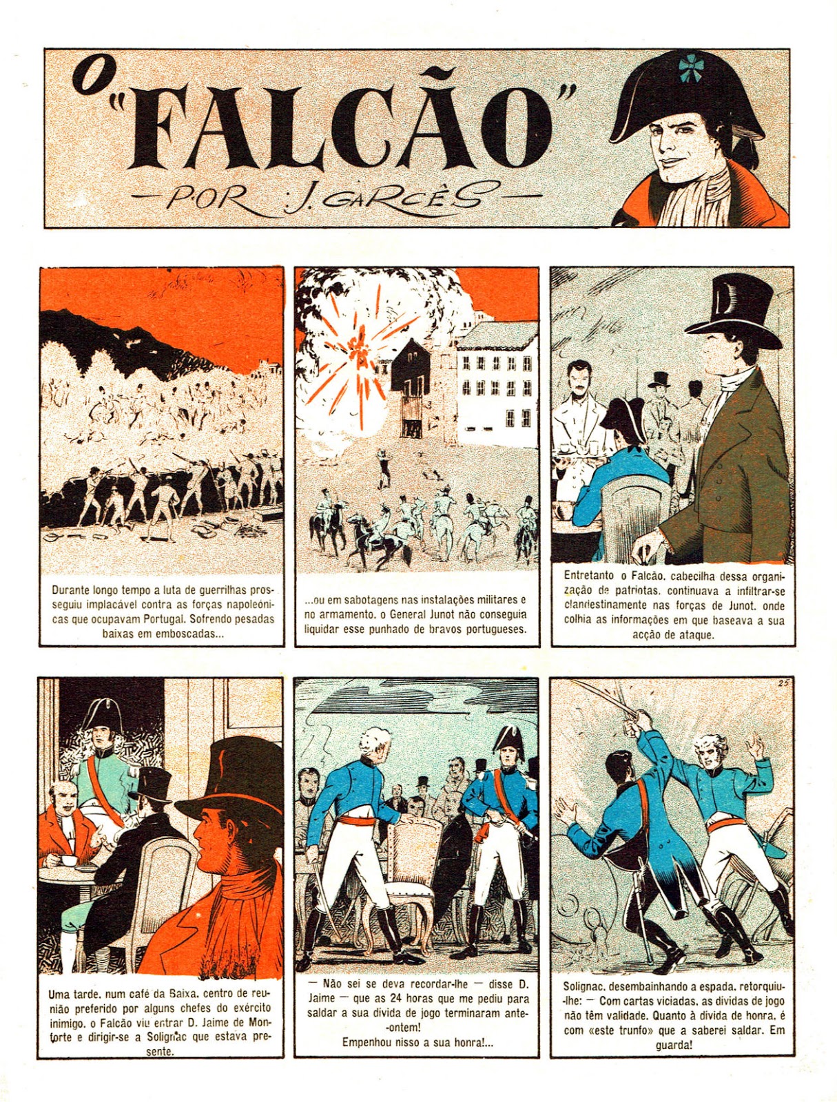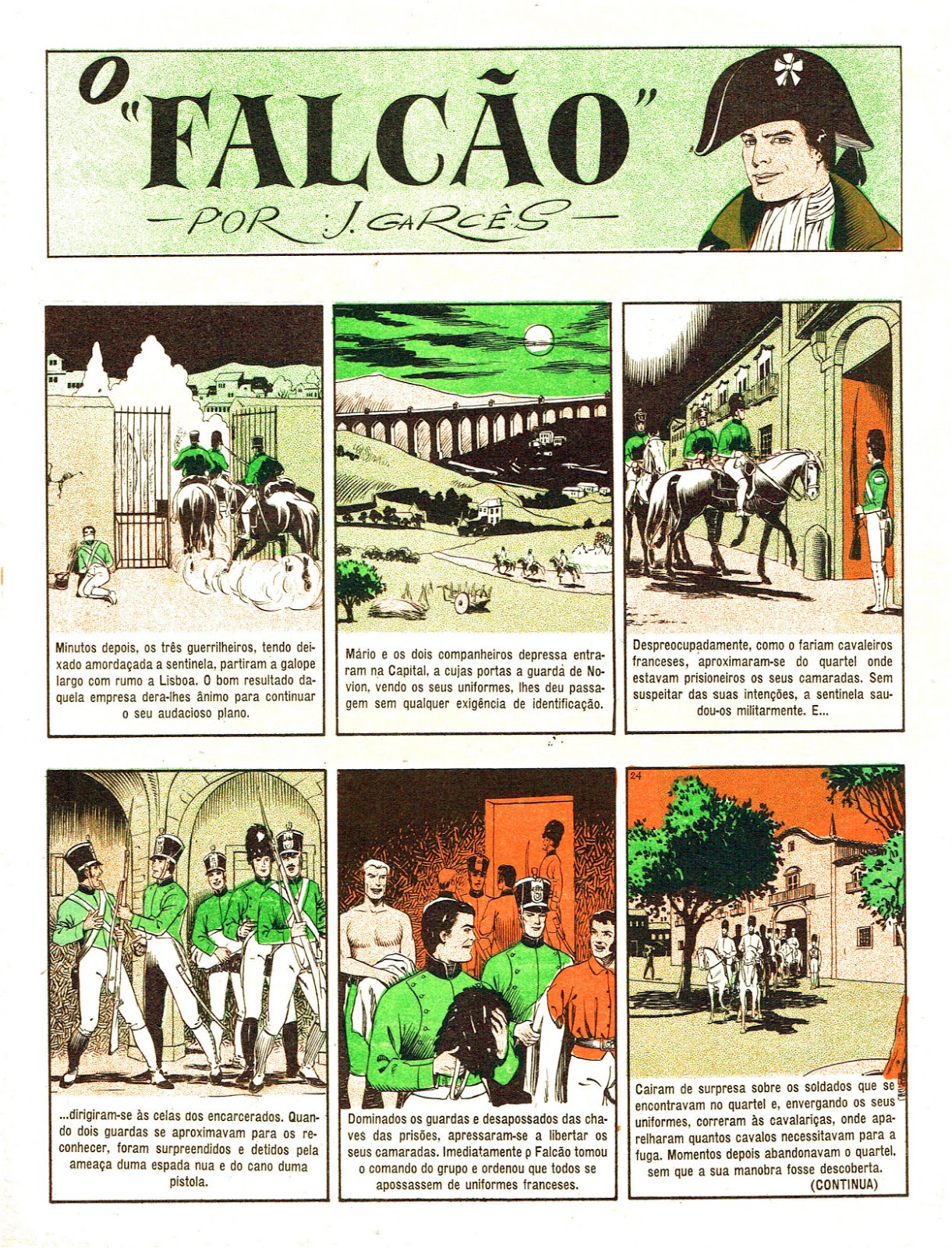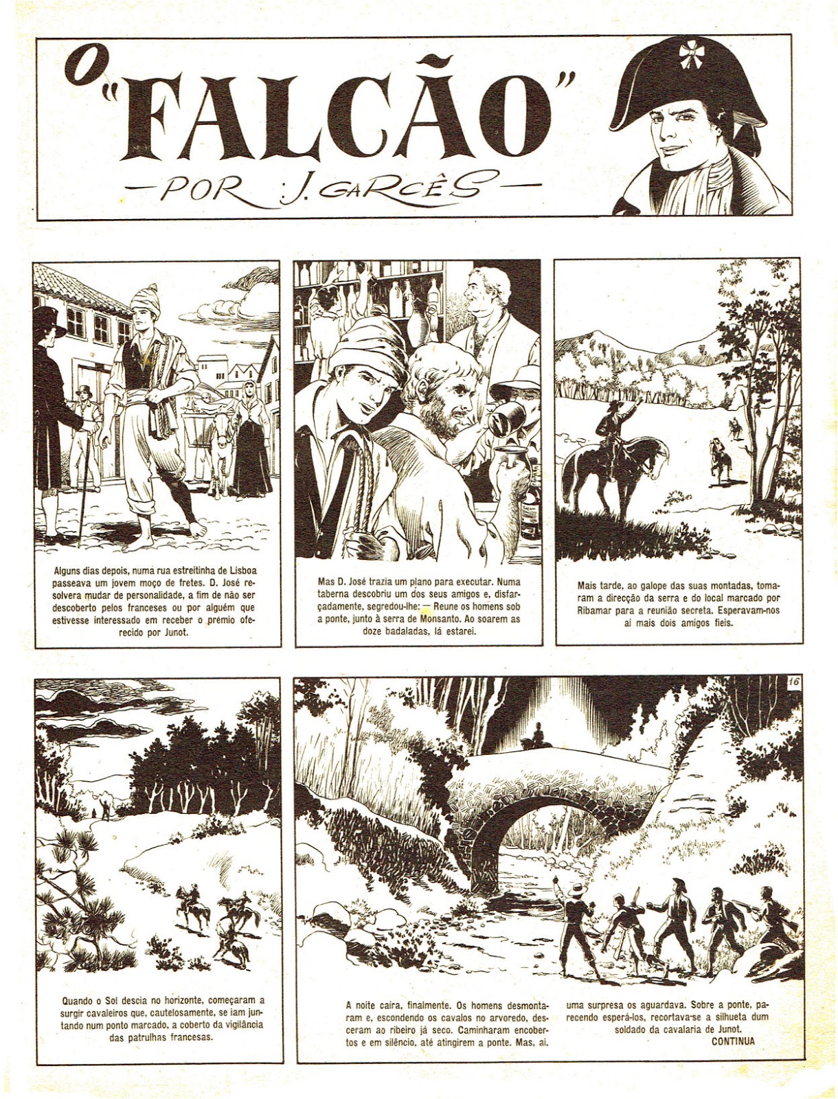 Eis mais um notável trabalho de Garcês, este retratando a resistência do povo português às invasões napoleónicas e denunciando o colaboracionismo de alguns oficiais. «O Falcão» foi publicado nos fascículos 73 a 103 do Cavaleiro Andante, com início em 23 de Maio de 1953.